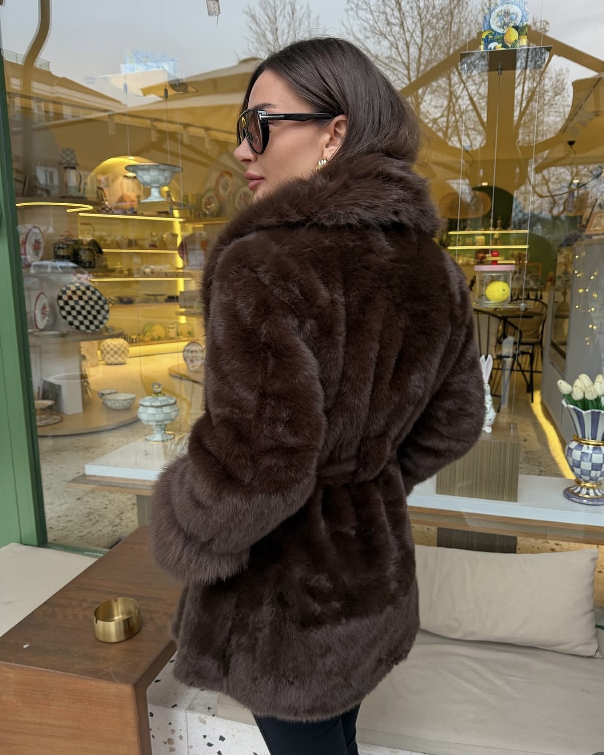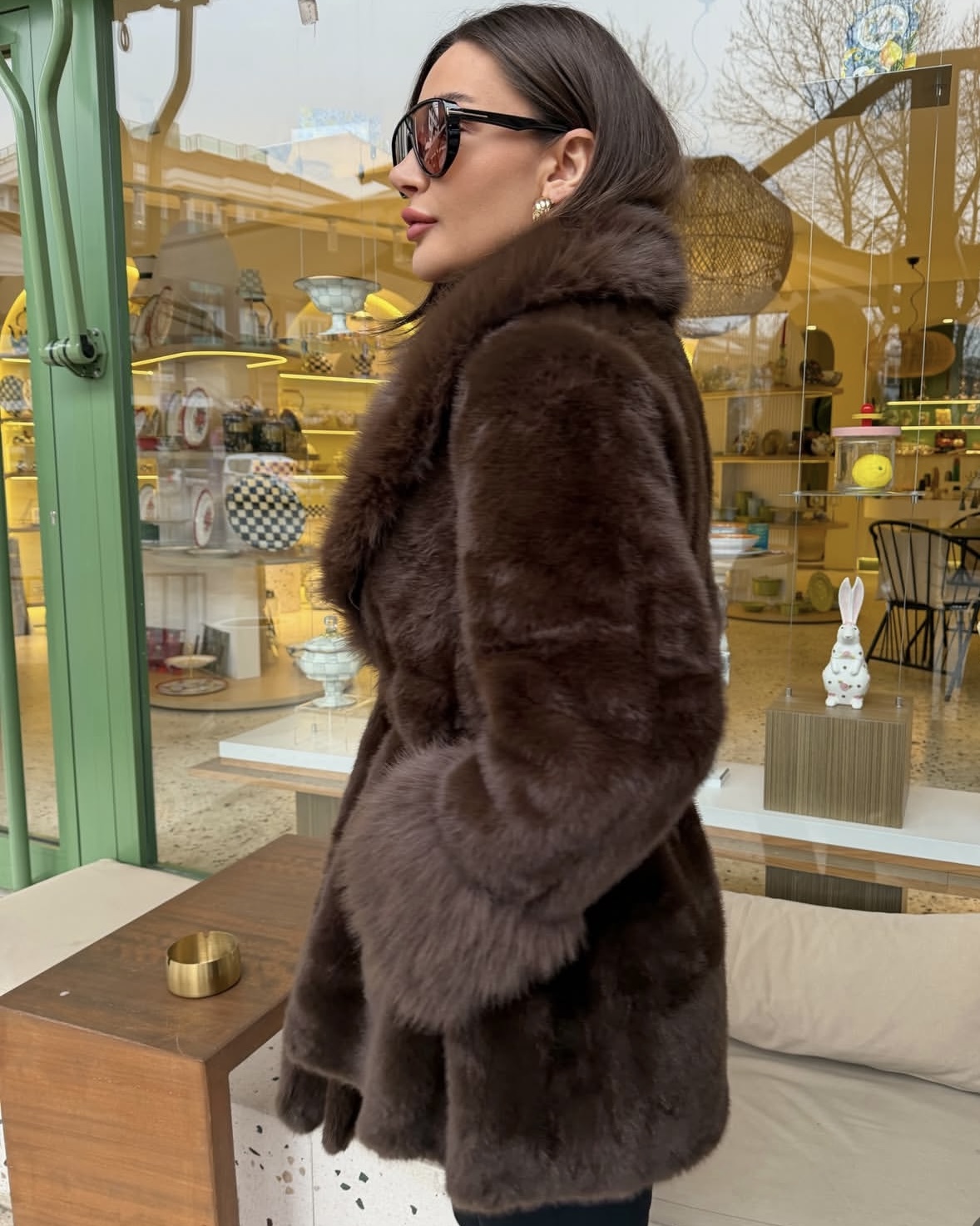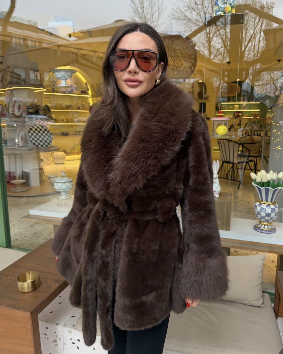 - Milena Brown Faux Fur Coat - Κομψό Καφέ Παλτό Οικολογικής Γούνας με Ζώνη